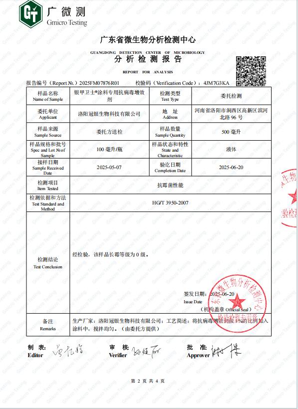 冠银生物以其在银离子行业应用领域的技术优势,参与编制了涂料行业国家标准GB/T21866《涂膜抗病毒活性和抗菌性测定法》,并将于近期发布实施。这体现了冠银生物在涂料银离子应用方面的专 业性,也为未来在涂料行业的拓展应用奠定了坚实基础。