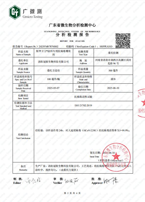 经第三方检测机构广州微生物检测,添加了1%涂料增效剂后的涂料,具备持久抗菌能力。经检验,长霉等级为0级;对肺炎克雷伯氏菌抗菌率>99.9%;对甲流病毒H3N2杀灭率>99.9%;对人冠状病毒的抗病毒活性率>99.9%
