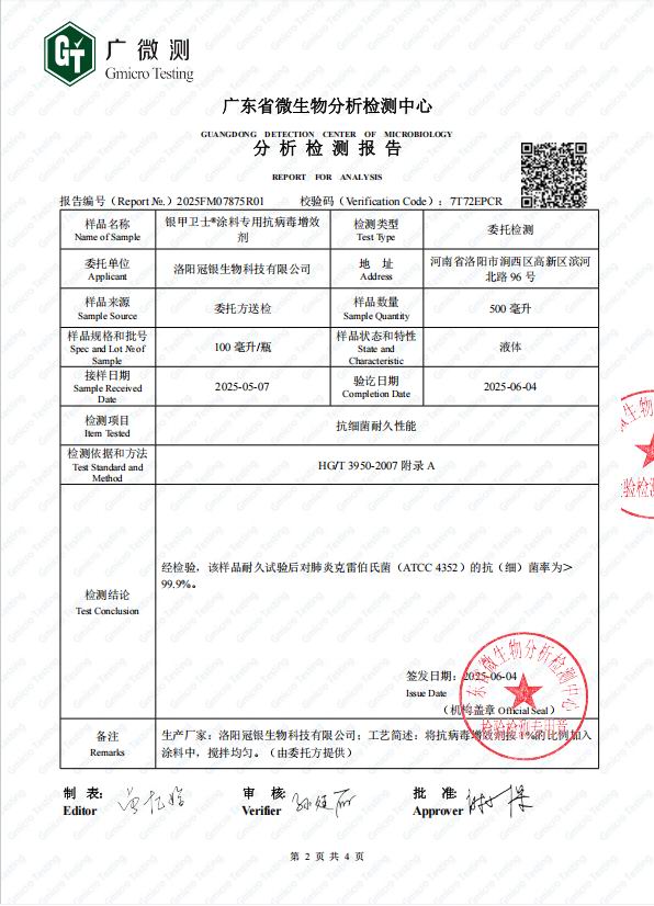 冠银生物以其在银离子行业应用领域的技术优势,参与编制了涂料行业国家标准GB/T21866《涂膜抗病毒活性和抗菌性测定法》,并将于近期发布实施。这体现了冠银生物在涂料银离子应用方面的专 业性,也为未来在涂料行业的拓展应用奠定了坚实基础。